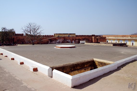 Pucca canals which are located on the surrounding hills brought rain water to those. Emergency requirements are fulfilled by these tanks. Out of these the largest tank is 158 feet long, 138 feet wide and 40 feet deep; water is stored in this tank which has a capacity of 60 lakhs gallon. The height of this canon is 5 km . By creating water harvesting structures, the water supply facilities in the fort was done n the Aravalli and conveying water through a canal on the west side of the fort which is located over a height 4 kilometres distance to be stored in three underground tanks below the central courtyard. Out of which one tank was used by prisoners for bathing, the second was used to store gold and jewellery and the third one was empty. These tanks also created a stir in the recent political history of the fort when they were searched for hidden treasure stashed for gemstones and jewellery of their Royal relatives which turned out is untrue. A water tank is located here which is linked to the canal. It is said that the kings of Amber or Jaipur used the compartments which are located below these water tanks to keep the gold and jewellery of their Royal relatives. This tank was opened once when Prime Minister Indira Gandhi said to open this during 1975-1977.